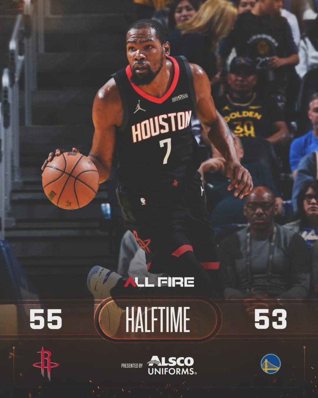 勇士第二节长时间使用三后卫,甚至一度祭出四后卫,篮板球被爆也在情理之中。半场战罢,火箭55-53领先勇士2分。杜兰特12分4板3助、小贾11分3板;桑托斯12分3板、库里10分。下半场开始,波神两记暴扣,其中一记2+1!
