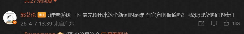 北京时间4月7日,郭艾伦发布社媒回应了此前多家媒体报道他被骗千万一事。郭艾伦随后在评论区询问:“谁告诉我一下,最先传出来这个新闻的是谁?有官方的报道吗?我要追究他们的责任。”相关阅读郭艾伦被诈骗千万元细节:被“十年兄弟”用年化22%忽悠入局“郭艾伦遭熟人诈骗千万”登上微博热搜第二,目前警方已立案处理有反转?郭艾伦:我没有被骗,网络造谣比真骗子还能编