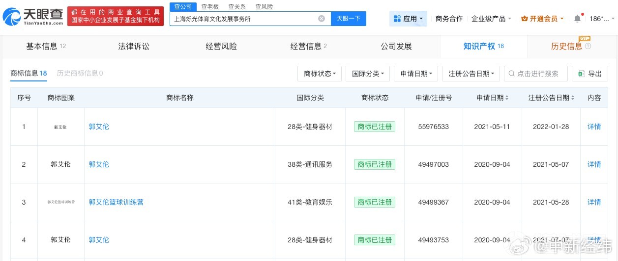 目前该事务所已注销。知识产权信息显示,该企业已注册多枚“郭艾伦”“郭艾伦篮球训练营”商标,国际分类涉及健身器材、通讯服务、教育娱乐等,当前商标状态多为已注册。