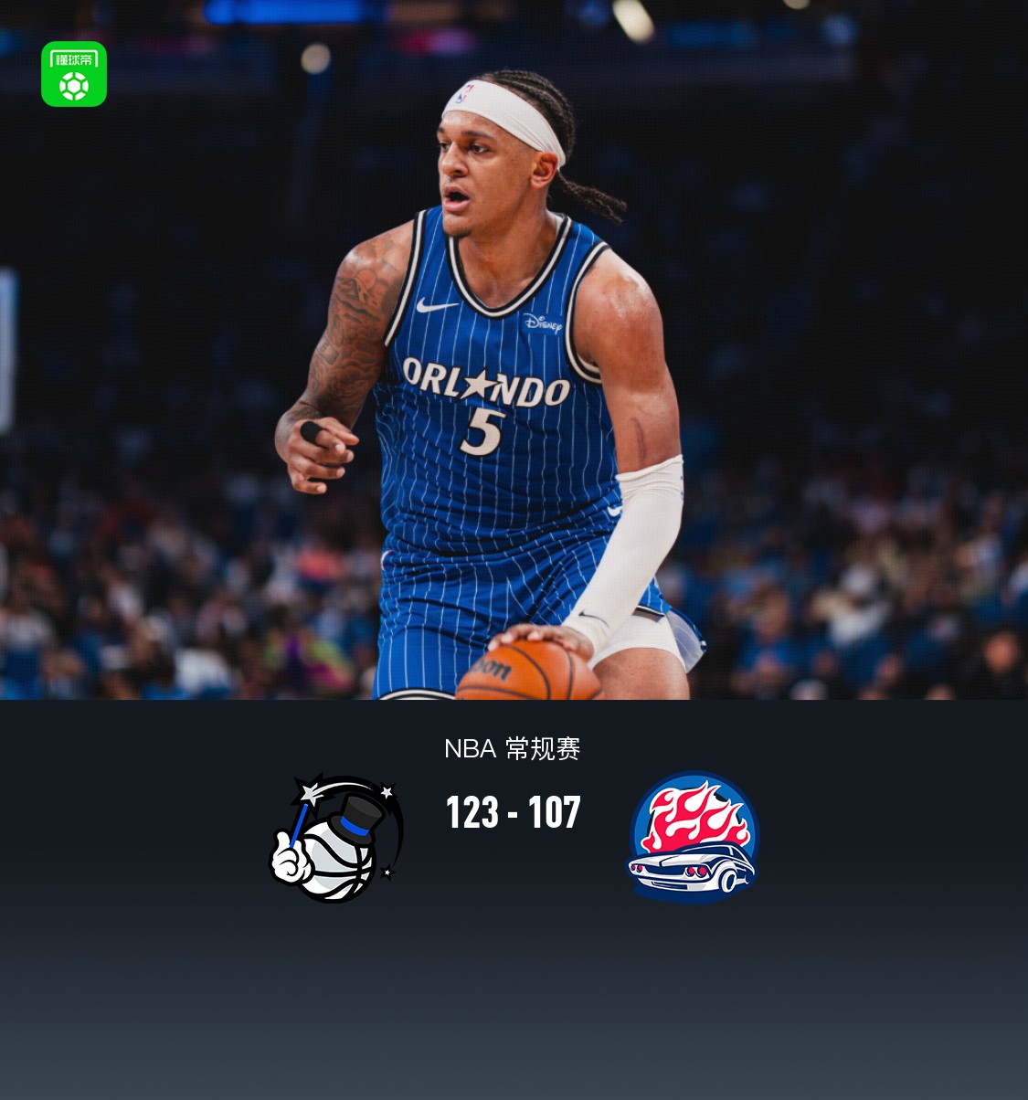 第四节魔术比塔泽拿下8分,活塞贾文特-格林拿下12分,最终魔术123-107战胜活塞