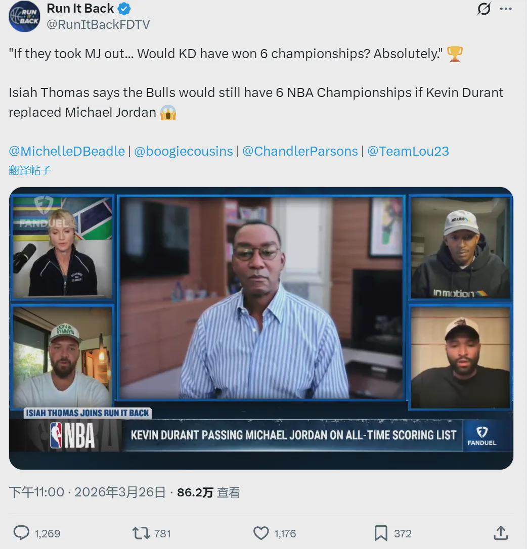 活塞名宿“微笑刺客”伊赛亚-托马斯说:“如果杜兰特在我们那个时代打球,他的身边有皮蓬、罗德曼和菲尔-杰克逊。杜兰特每晚都能在中距离背身要球,每晚出手25-30次,他也能做到和乔丹一样的事情,率领公牛拿到6个总冠军。”