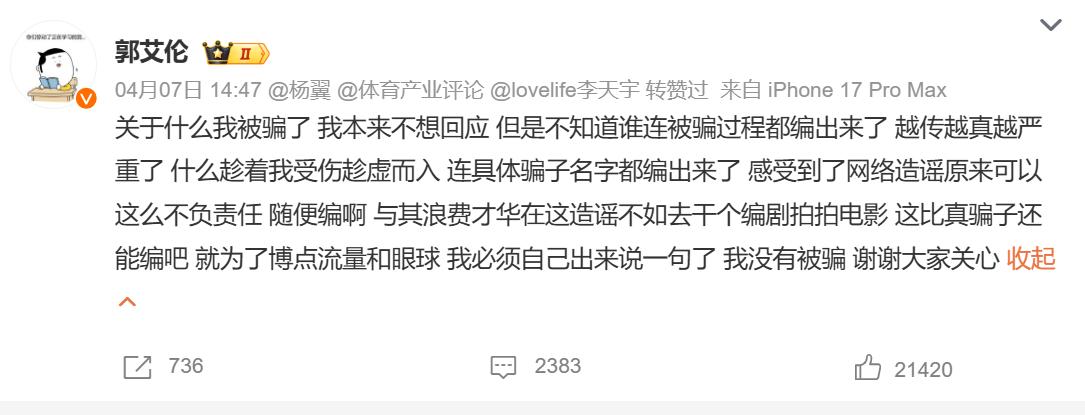 不得不说,郭艾伦这件事情确实是很蹊跷,他到底有没有被骗,为什么在4月5日消息传出的当天不辟谣,而是放任事情发酵了两天才出来辟谣,又是为什么把态度从强硬变成了草草带过。或许,郭艾伦后面的一些参加节目的计划可以告诉大家答案。