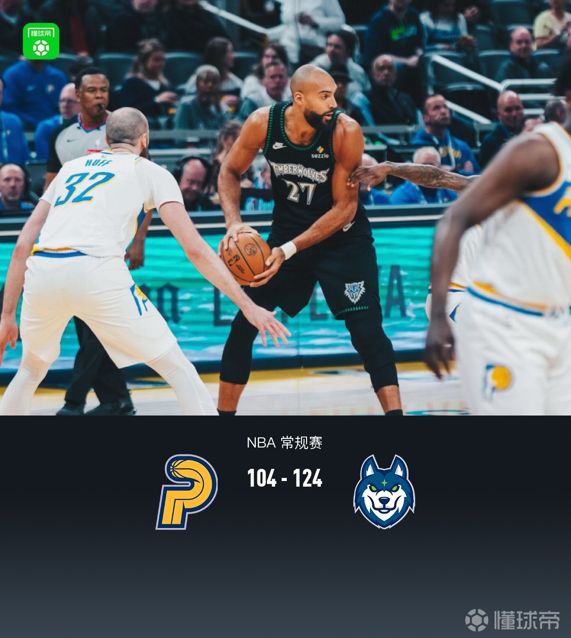 第四节步行者斯劳森拿下7分,森林狼海兰德拿下8分,最终步行者104-124不敌森林狼