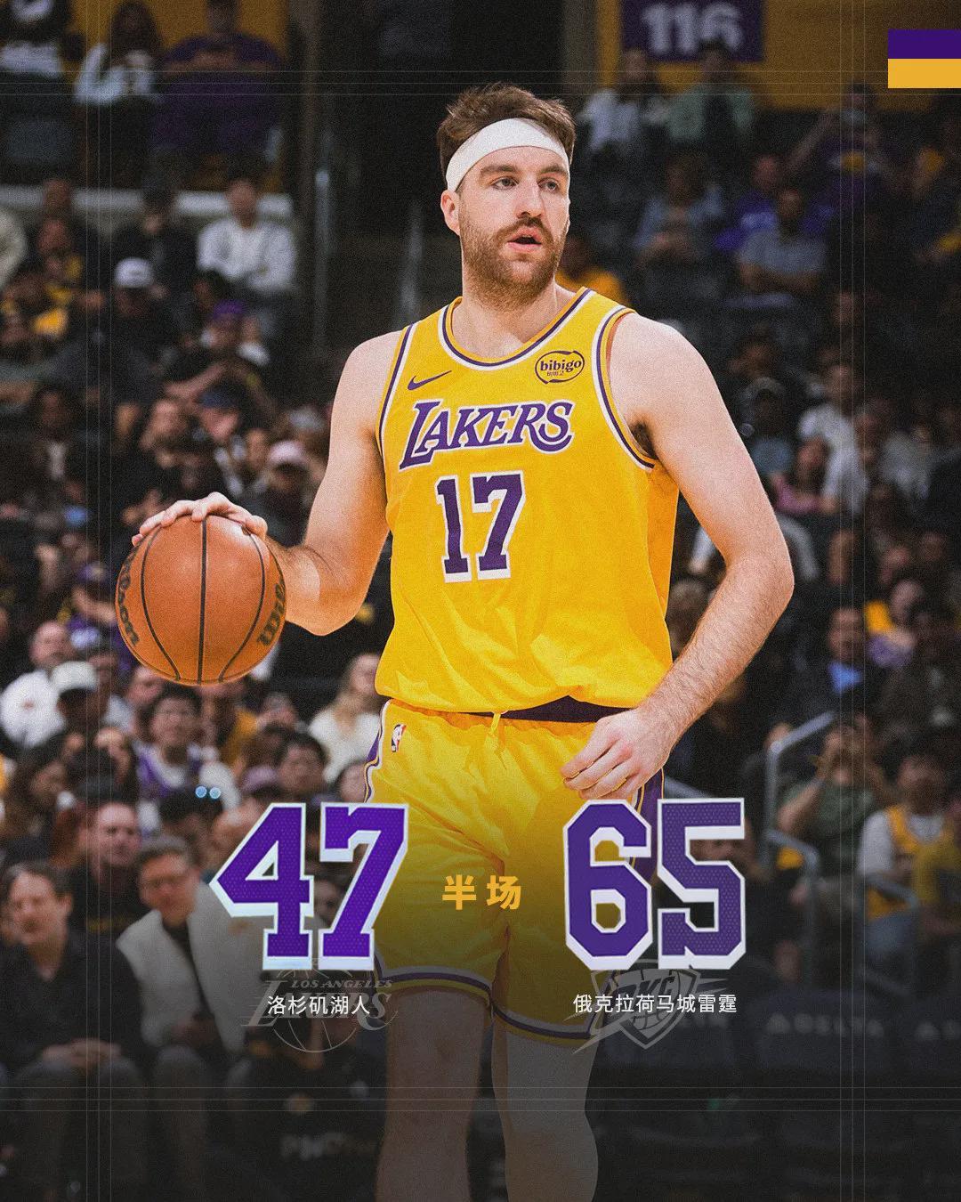 第二节湖人42比42一度追平比分,有球迷开始幻想,今天有没有机会爆冷?事实证明想多了,第二节后半节,雷霆轰出23-5的攻击波,一举拉开到20分左右。半场战罢,雷霆65-47领先湖人18分,以赛亚-乔三分5中4砍下12分。