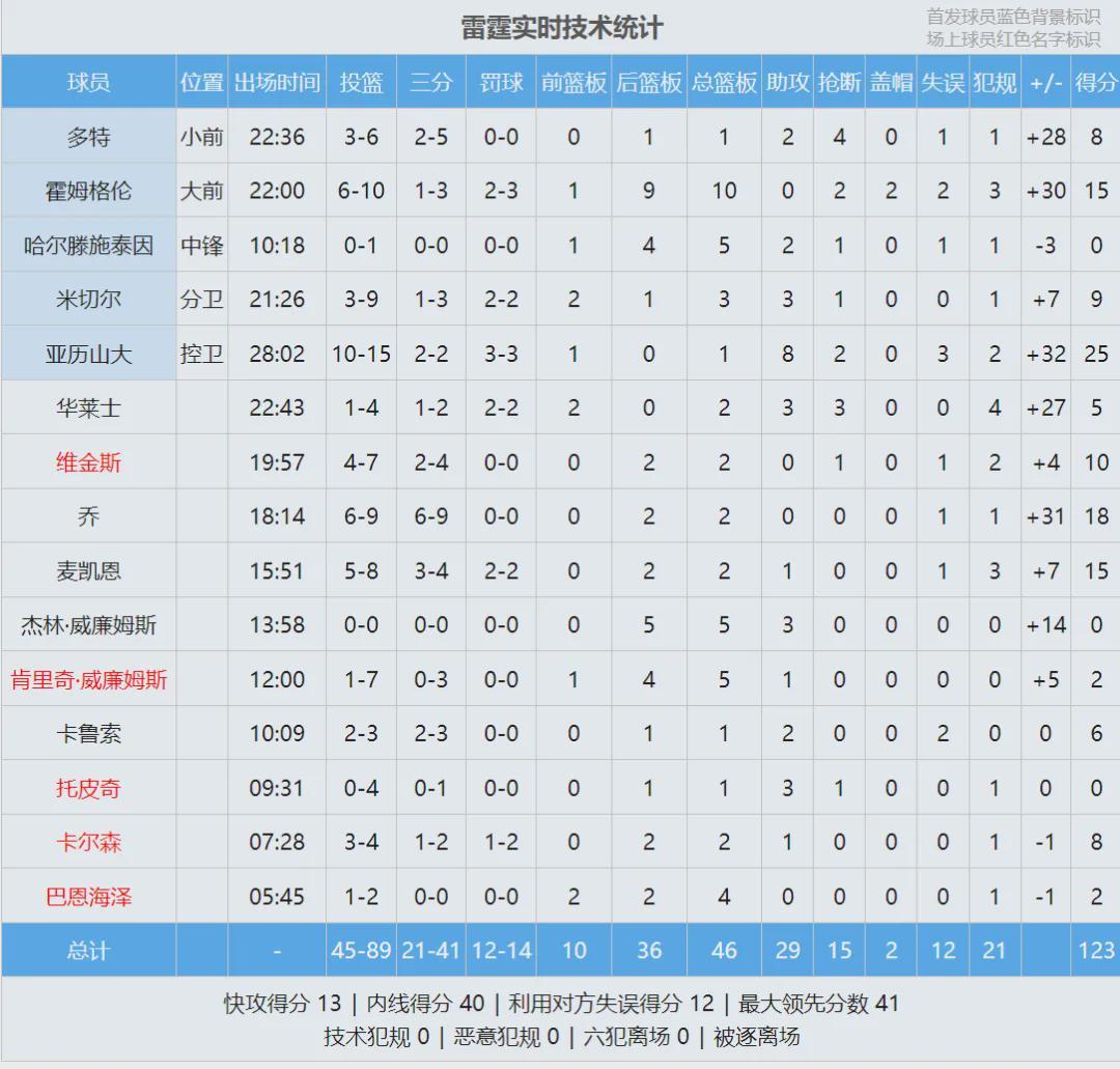 湖人继续排名西部第四,落后掘金1个胜场。最后看看数据,说说你的感受: