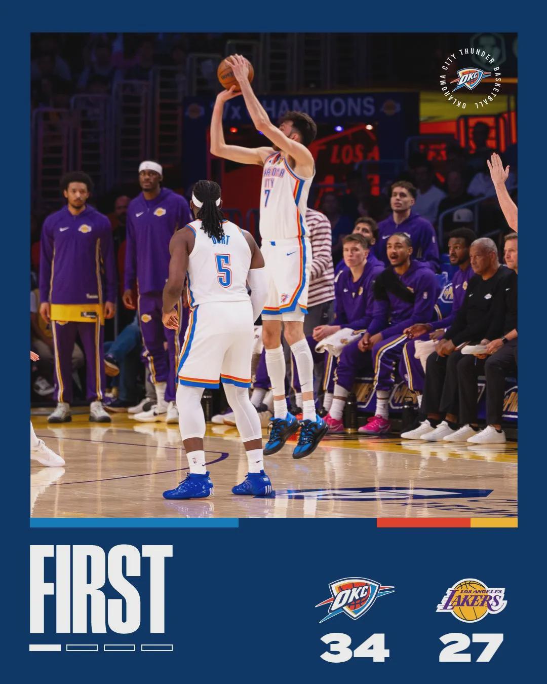 范德彪造成三分犯规,居然三罚不中。首节战罢,雷霆34-27领先湖人7分,亚历山大5投4中,单节砍下11分5助攻。上一次雷霆打湖人,第一节领先23分。不过话说回来,湖人多名主力缺阵,今天雷霆的防守比较松散,没什么强度。