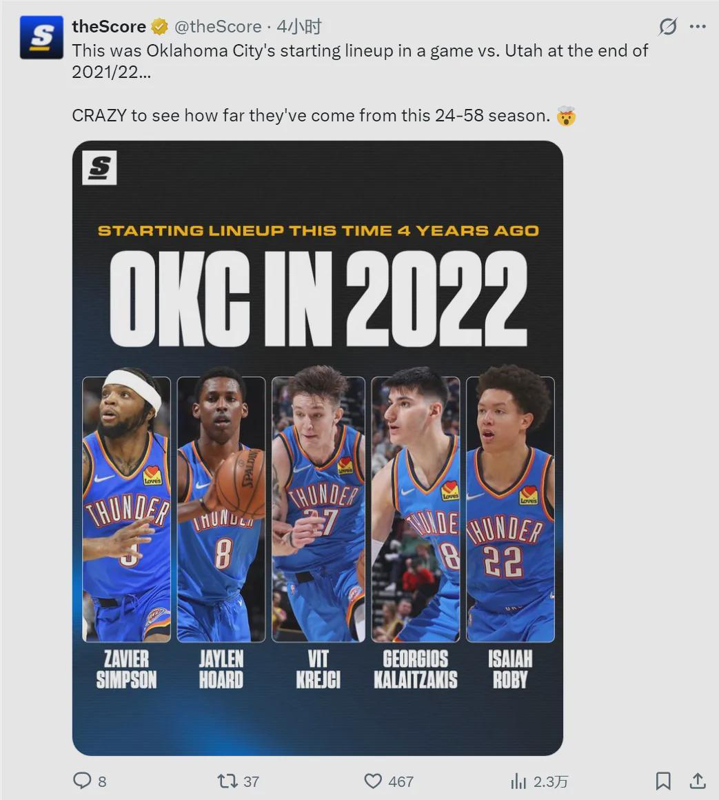雷霆首发:亚历山大、阿杰伊-米切尔、多尔特、霍姆格伦、哈滕。过去22场雷霆豪取20胜2负,只输给了活塞和凯尔特人。美媒TheScore晒出雷霆2021-22赛季常规赛收官阶段的首发:“雷霆从24胜58负一路走来,太不可思议了。”