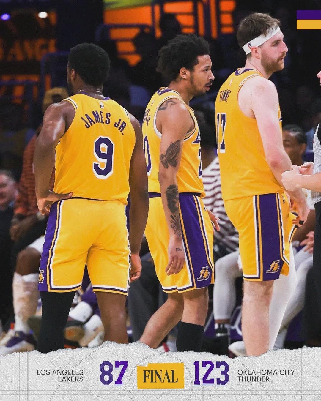 第四节双方换上纯替补阵容,雷霆单节30-25净胜5分。全场结束,雷霆123-87大胜湖人36分,本赛季4比0横扫湖人。这四场比赛,雷霆分别净胜29分、9分、43分和36分,合计117分。最近一周,雷霆两次跟湖人交手,赢了79分!