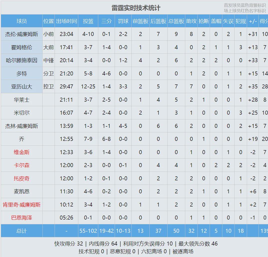 整个第四节都是垃圾时间,全场结束,雷霆139-96狂虐湖人43分!亚历山大出战29分47秒,提前打卡。25投12中,砍下28分7篮板7助攻,正负值+35全场最高。湖人这边,东契奇12+4+7,里夫斯15+4+4,詹姆斯13+6+2。