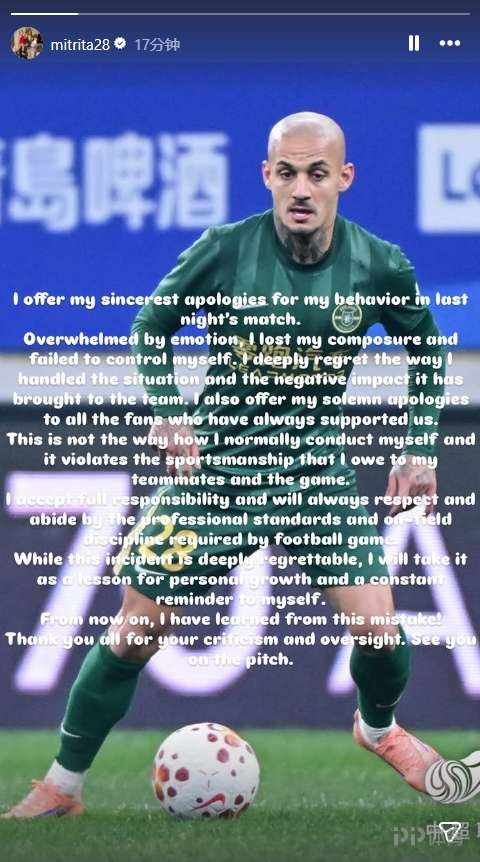 情绪失控之下,我没能保持冷静、约束自身行为。我对自己处理该事件的方式,以及给球队带来的负面影响,深感懊悔。同时,我也向所有一直支持我们的球迷,作出郑重道歉。