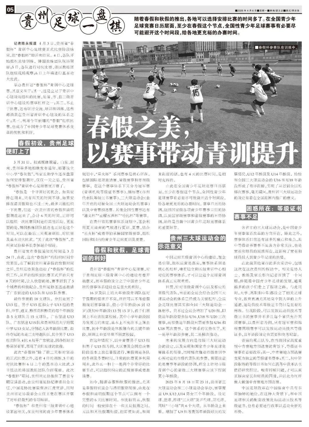 3月31日,权威媒体报道,山东、湖南、贵州等多地相继发布通知,部署设立中小学“春秋假”,当家长和学生还在盘算如何安排假期时,仅仅一天之后,贵州省“春假杯”青训中心足球赛便开赛了。