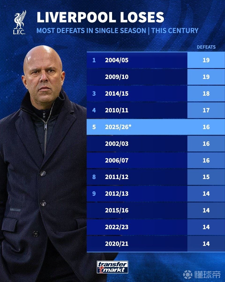 4月6日,德国转会市场网站列出了利物浦本世纪单赛季输球场次排行,利物浦本赛季已输16场(含社区盾点球大战告负),位列第五。