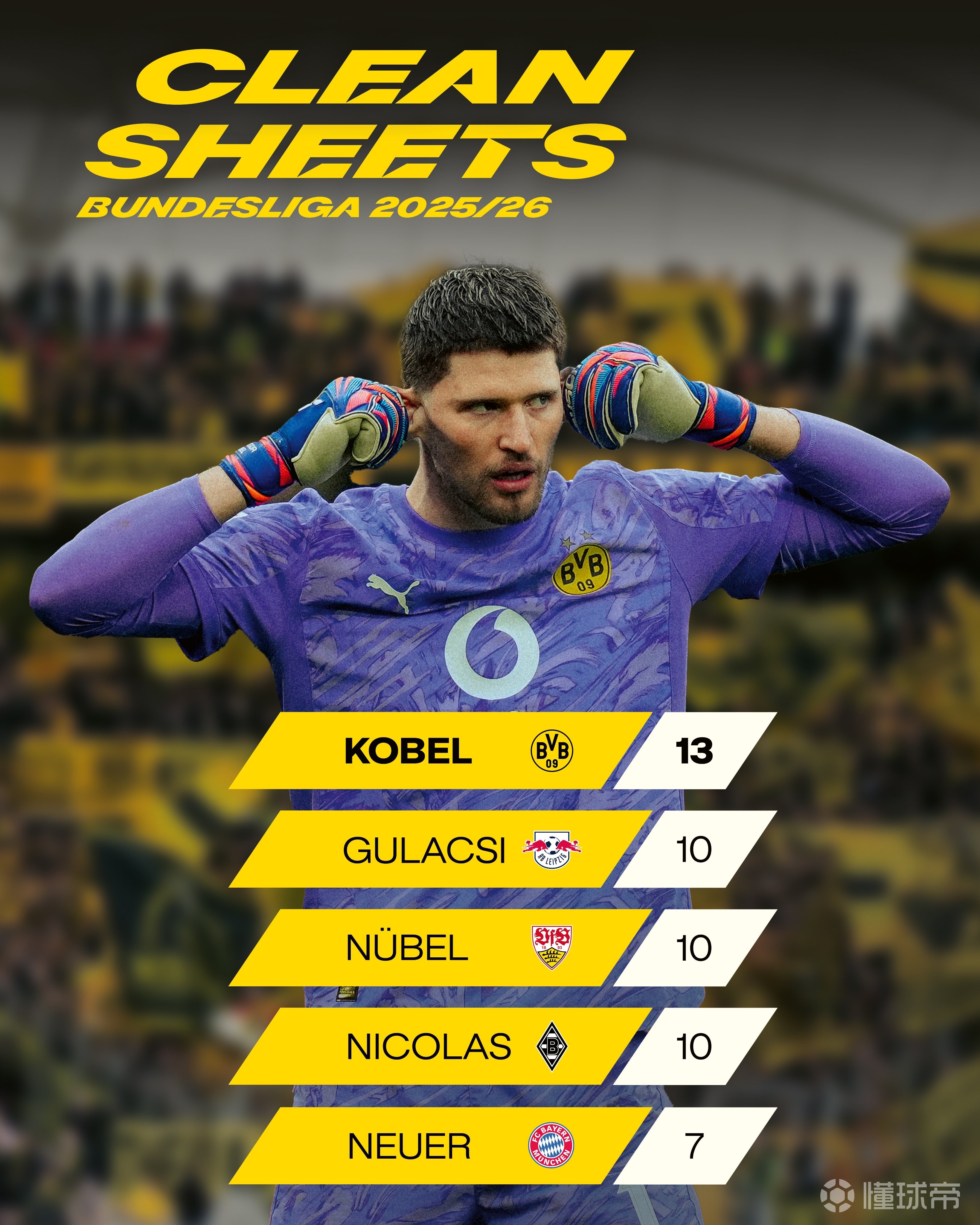 北京时间4月6日,多特官方发布了本赛季德甲门将零封榜单,其中多特门将科贝尔排名第一。本赛季德甲门将零封榜1.科贝尔(多特蒙德) 13场2.古拉西奇(莱比锡) 10场2.努贝尔(斯图加特) 10场2.莫里茨-尼古拉斯(门兴格拉德巴赫) 10场5.诺伊尔(拜仁慕尼黑) 7场本赛季,科贝尔在德甲首发28场,完成13次零封,诺伊尔受到伤病影响在德甲首发20场,完成7次零封。