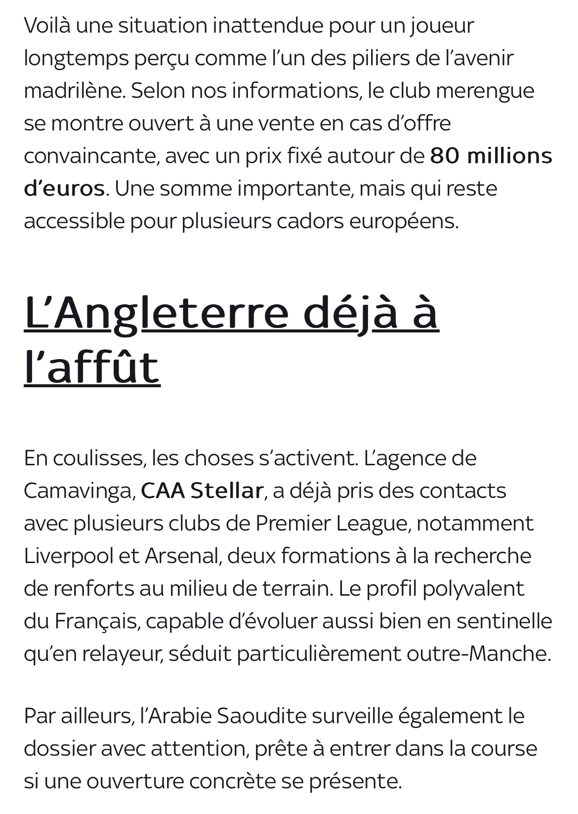 据悉,利物浦和阿森纳目前似乎是最有机会尝试的球队,沙特俱乐部也在虎视眈眈。但只要卡马文加坚持要在马德里取得成功,这桩交易就会很复杂。
