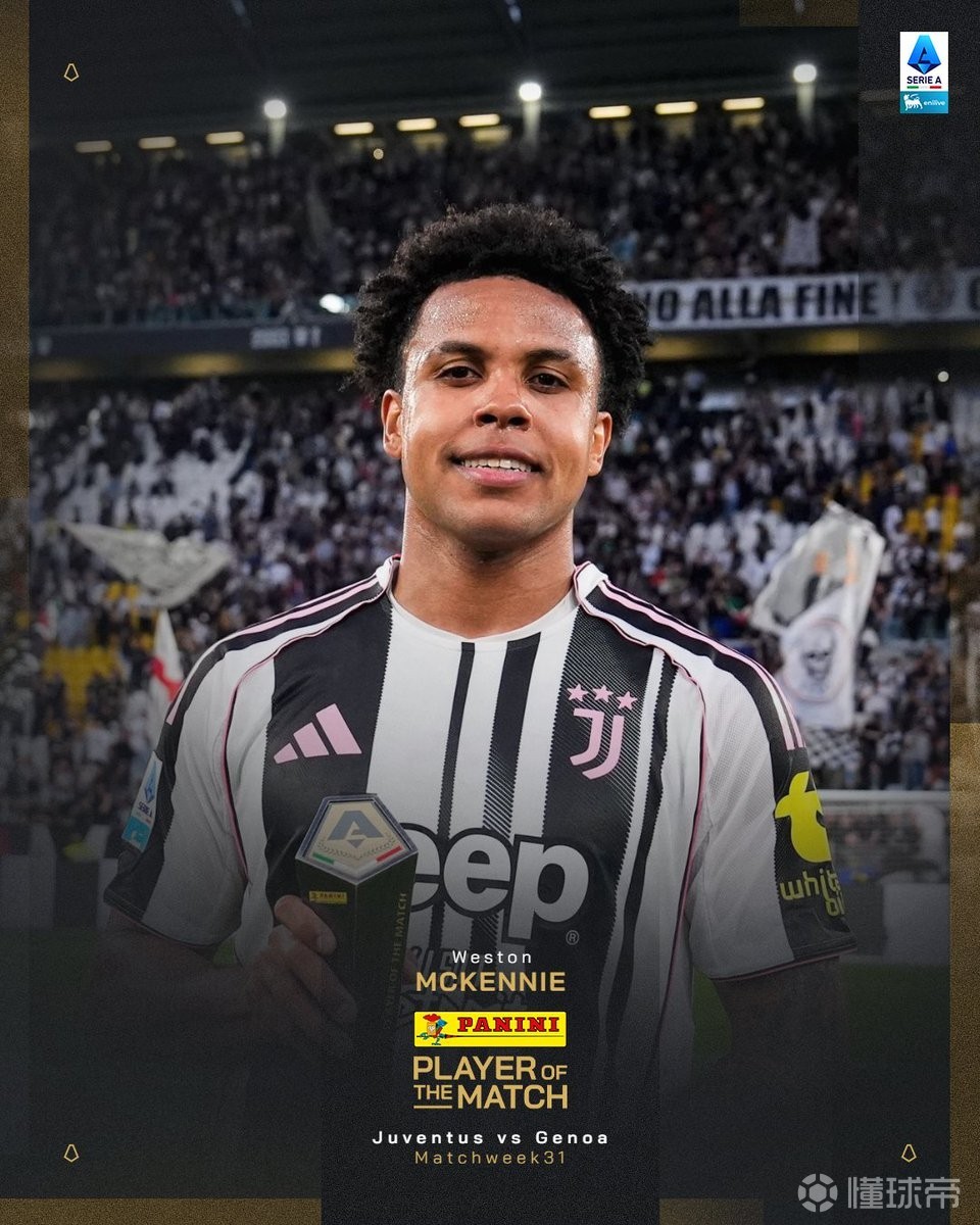 北京时间4月7日,在意甲第31轮的比赛中,尤文图斯主场2-0击败热那亚,将他们与欧冠区的积分差距缩小到1分。赛后,此战打进一球的麦肯尼被意甲官方评为了本场比赛的最佳球员。