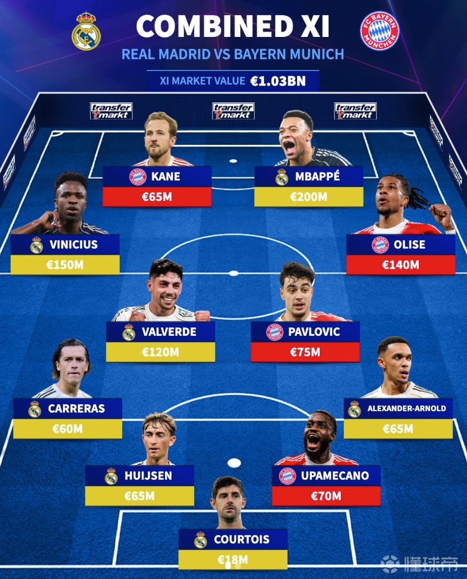 北京时间4月7日,在欧冠1/4决赛首回合皇家马德里主场与拜仁慕尼黑的焦点战即将打响的情况下,德转列出了两支球队目前身价最高的11人阵容,皇马7人入选,姆巴佩2亿欧元领衔,拜仁占据4席。