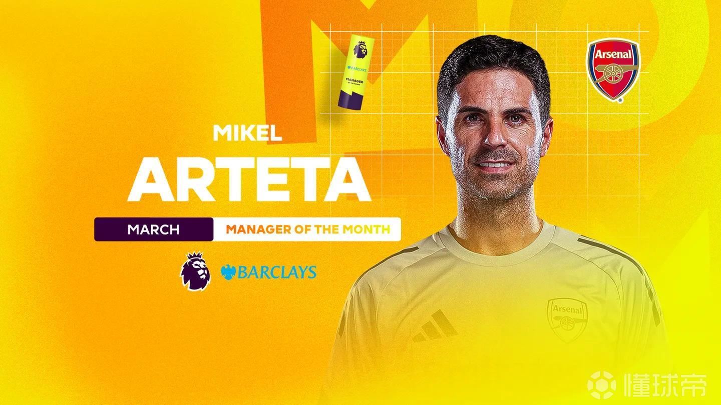 北京时间4月3日,英超官方宣布,阿森纳主帅阿尔特塔当选联赛3月最佳教练。
