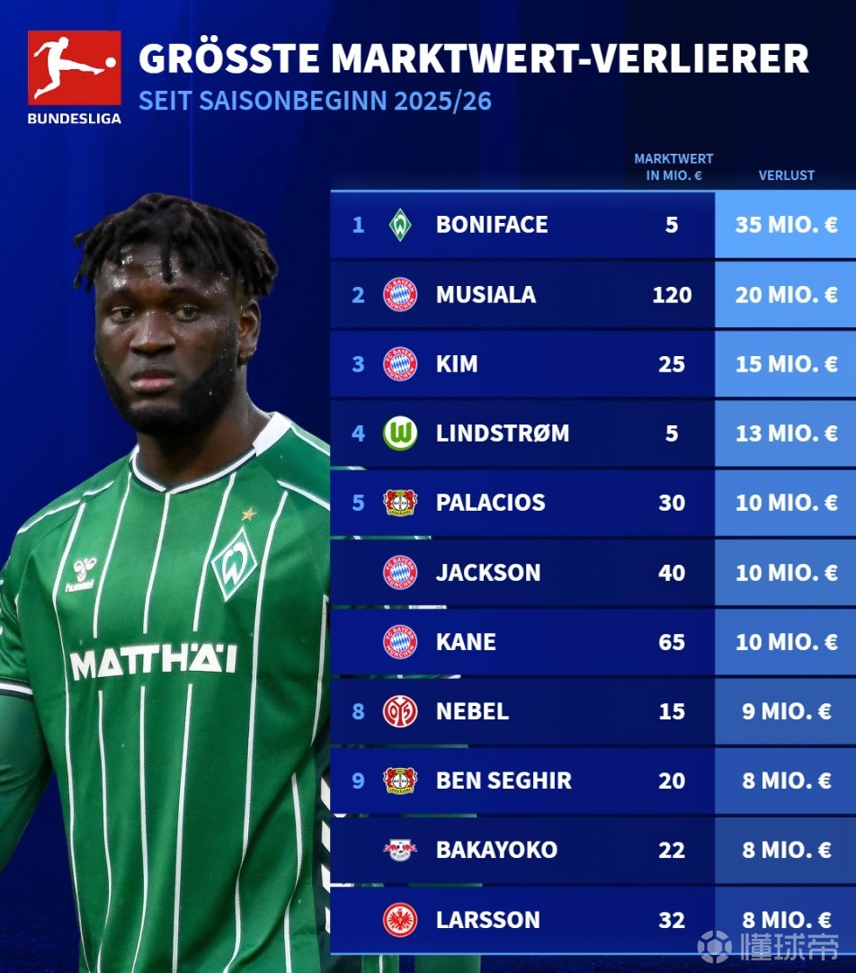 本赛季德甲身价跌幅榜:博尼费斯暴跌3500万第1,穆西亚拉第2