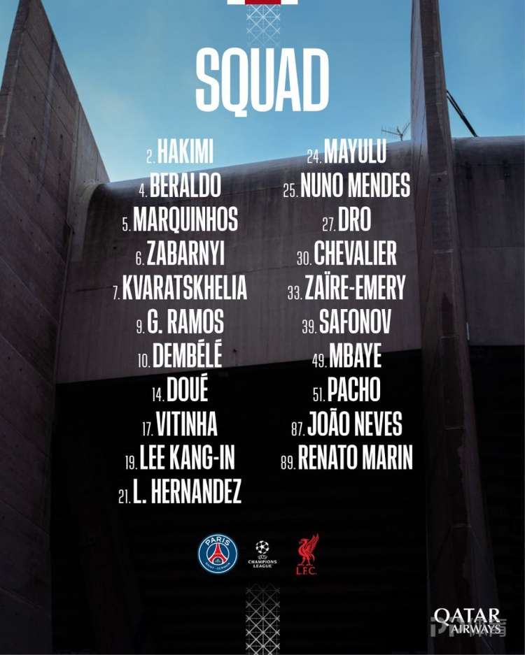 北京时间明天凌晨,巴黎将在欧冠1/4决赛首回合比赛中主场对阵利物浦,巴黎公布了此役的球员名单,登贝莱、阿什拉夫。