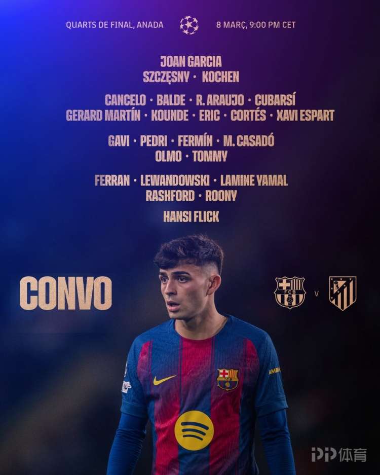 北京时间明天凌晨,欧冠1/4决赛首回合,巴萨主场对阵马竞,赛前巴萨公布本场大名单,贝尔纳尔、德容缺席。巴萨首回合大名单:门将:霍安·加西亚、什琴斯尼、科亨后卫:坎塞洛、巴尔德、阿劳霍、库巴西、马丁、孔德、埃里克·加西亚、科尔特斯、埃斯帕特中场:加维、佩德里、费尔明、卡萨多、奥尔莫、托米·马克斯前锋:费兰·托雷斯、莱万、亚马尔、拉什福德、鲁尼·巴德吉 责任编辑: 体育24小时热点