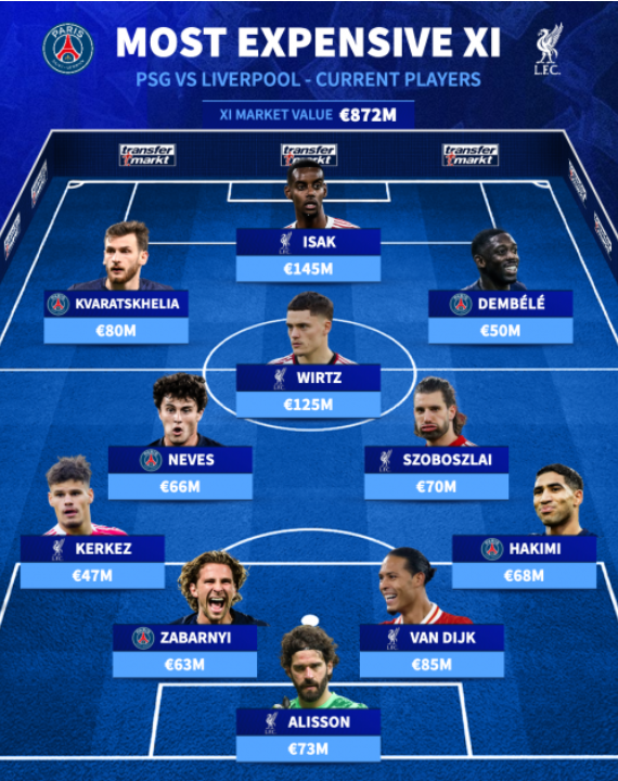 这套由两队球员组成的“最贵11人”阵容,总身价高达8.72亿欧元。其中,利物浦贡献了6名球员,巴黎圣日耳曼则有5人入选。