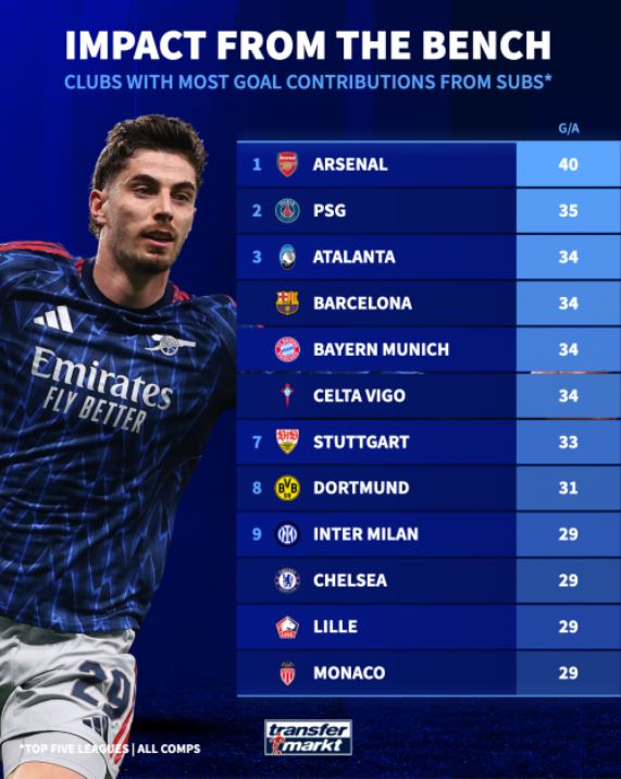 德国转会市场(Transfermarkt )利用庞大的数据库,统计了本赛季五大联赛各项赛事中,哪些俱乐部的替补球员进球贡献最多。