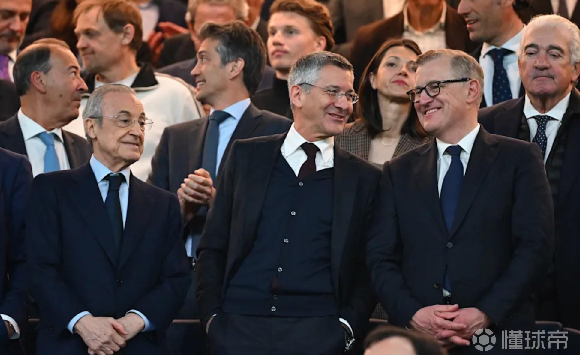 皇马主席弗洛伦蒂诺-佩雷斯(79岁)与拜仁主席赫伯特-海纳(71岁)、CEO德雷森(58岁)同框。
