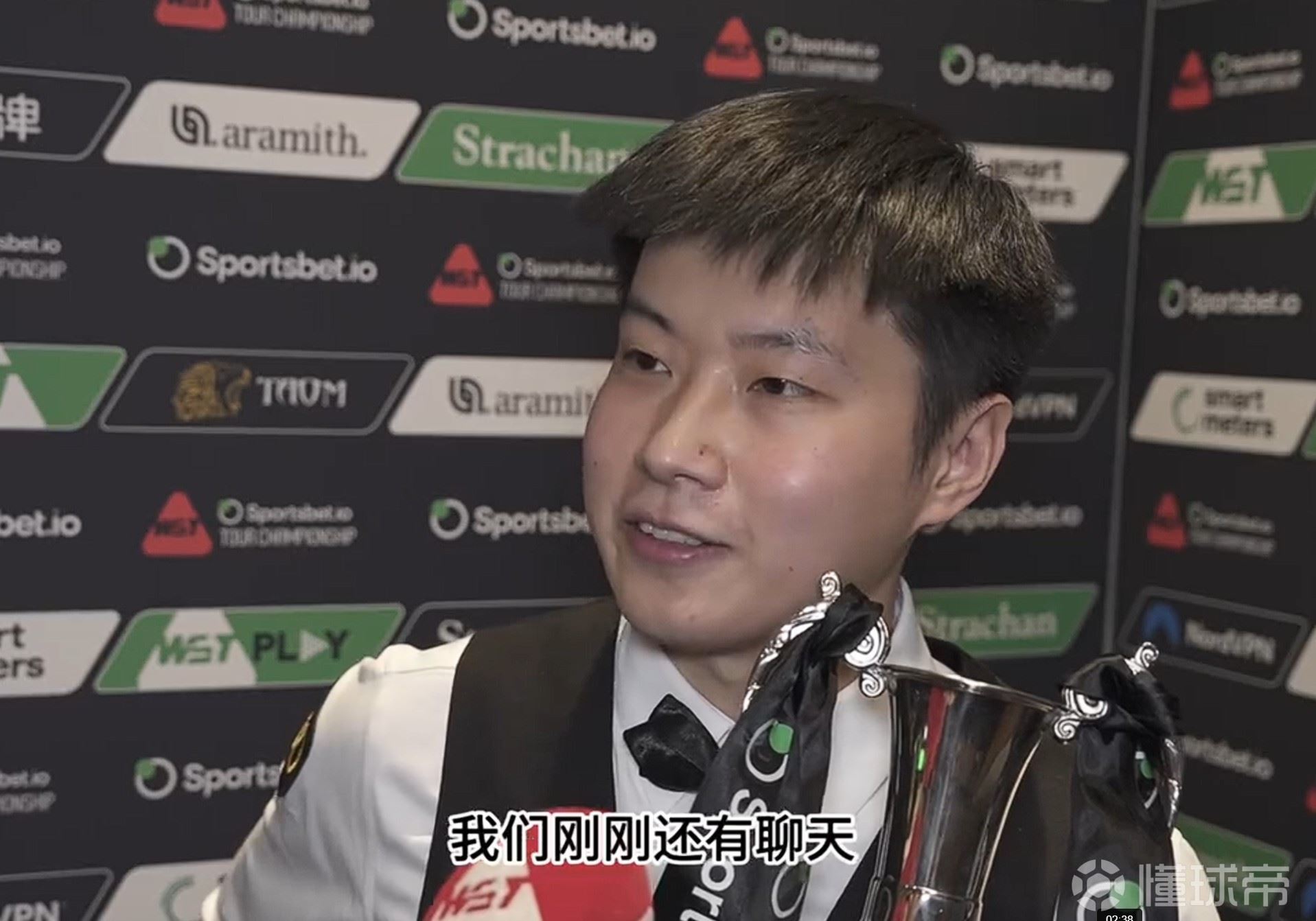 赵心童:“嗯,对,我们刚刚还有聊天,他那会儿刚拿完(单打世界杯)冠军,我说我晚上还要再奋斗一下。我也恭喜他第一次拿到这个世界冠军。