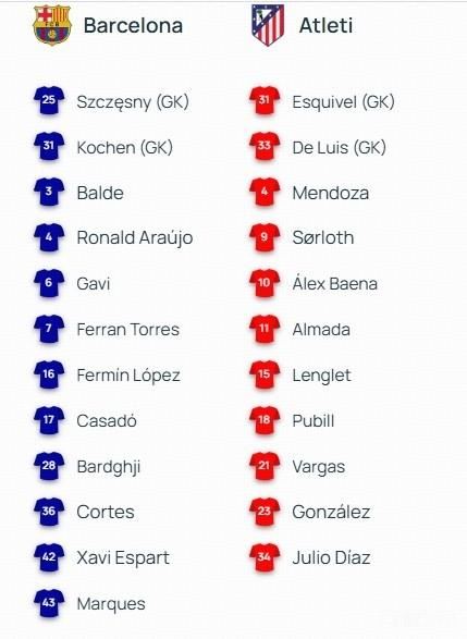 巴萨首发:13-霍安-加西亚、5-库巴西、18-马丁、24-加西亚、23-孔德、2-坎塞洛、8-佩德里、20-奥尔莫、10-亚马尔、14-拉什福德、9-莱万
