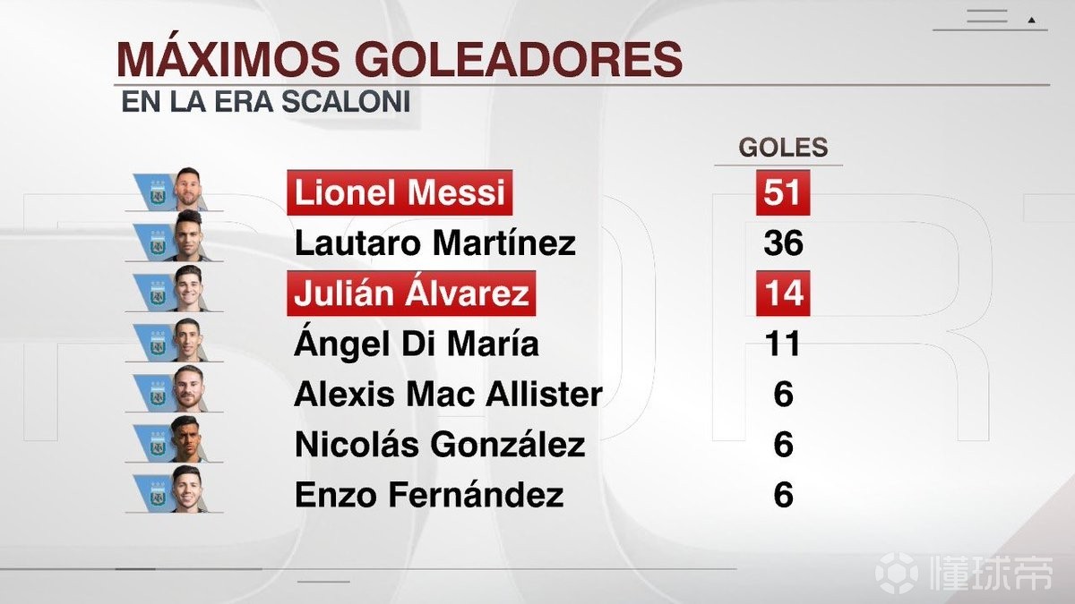 北京时间4月1日,阿根廷国家队在友谊赛中5-0大胜赞比亚,胡利安-阿尔瓦雷斯、梅西、奥塔门迪以及巴伦廷-巴尔科分别破门,对手还送上了乌龙大礼。赛后根据统计,算上本场比赛的进球,梅西和胡利安-阿尔瓦雷斯分别以51球和14球位列斯卡洛尼治下阿根廷队的第一和第三射手。斯卡洛尼治下阿根廷队射手榜:1. 梅西 51球2. 劳塔罗 36球3. 胡利安-阿尔瓦雷斯 14球4. 迪马利亚 11球5. 麦卡利斯特 6球5. 尼古拉斯-冈萨雷斯 6球5. 恩佐-费尔南德斯 6球
