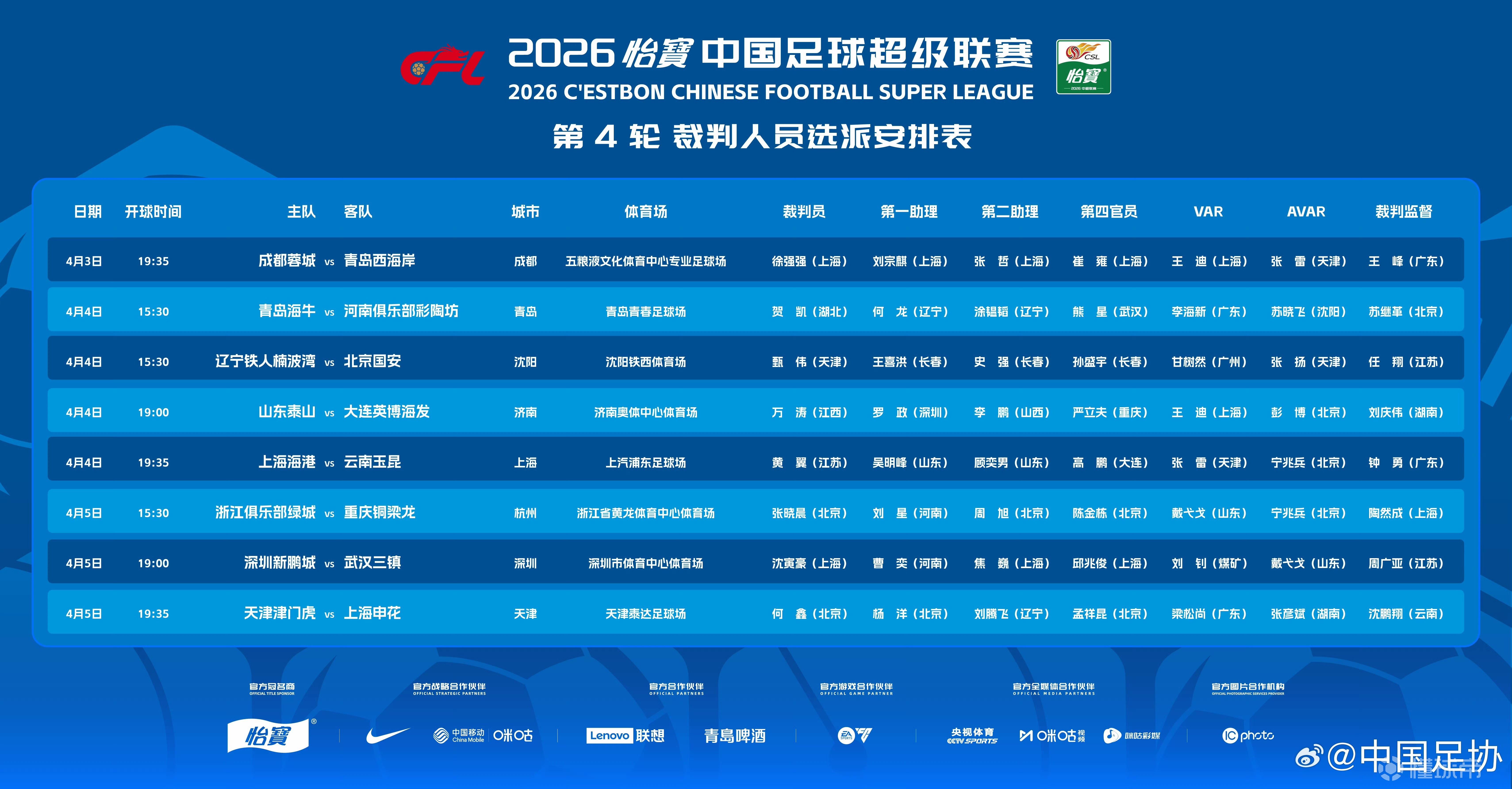 北京时间4月3日,中超第4轮裁判名单公布,万涛执法山东泰山vs大连英博,何鑫吹天津津门虎vs上海申花。在中超第2轮漏判点球的麦麦提江、唐顺奇仍未出现在裁判名单中。