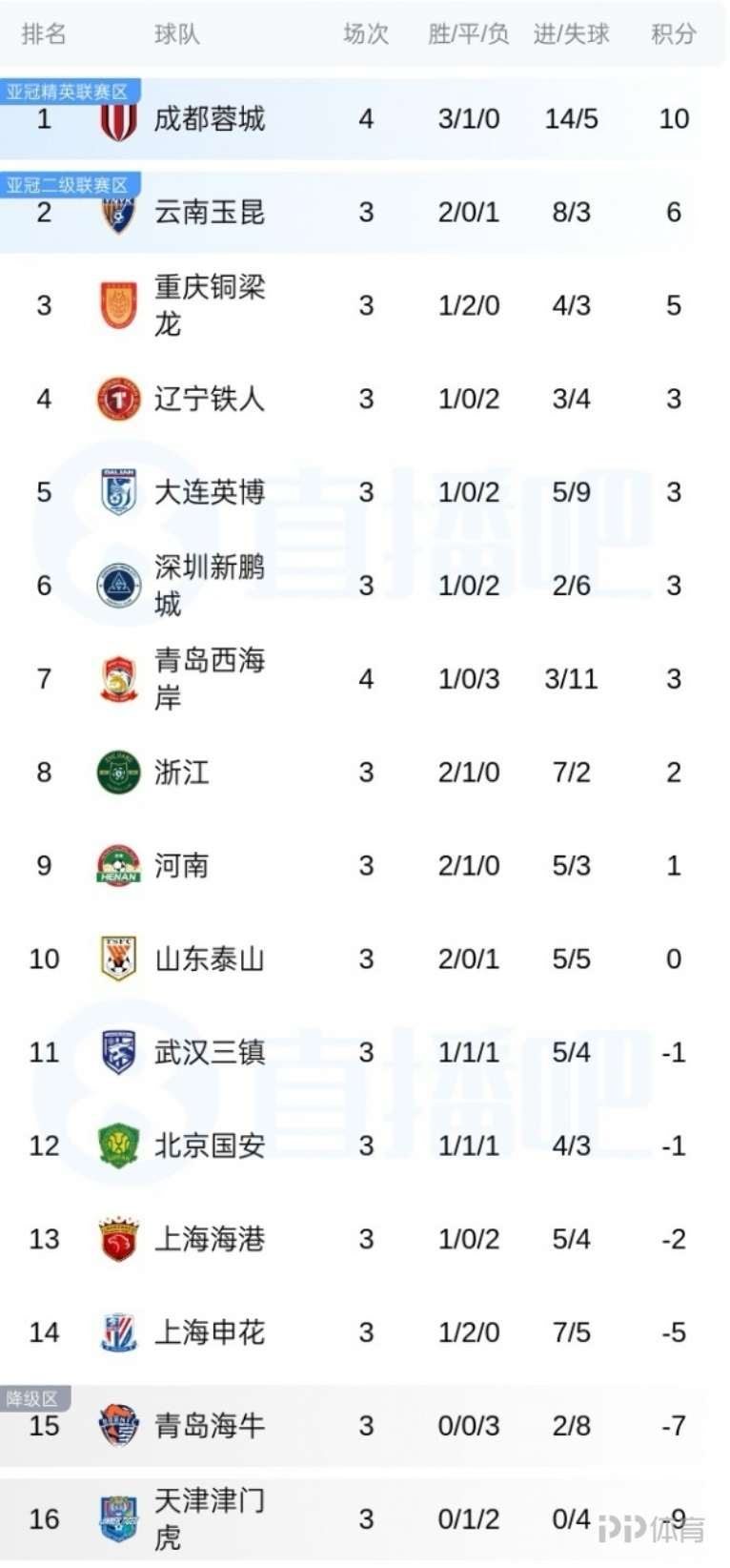 中超积分榜:蓉城3胜1平先赛4分领跑 西海岸暂第7