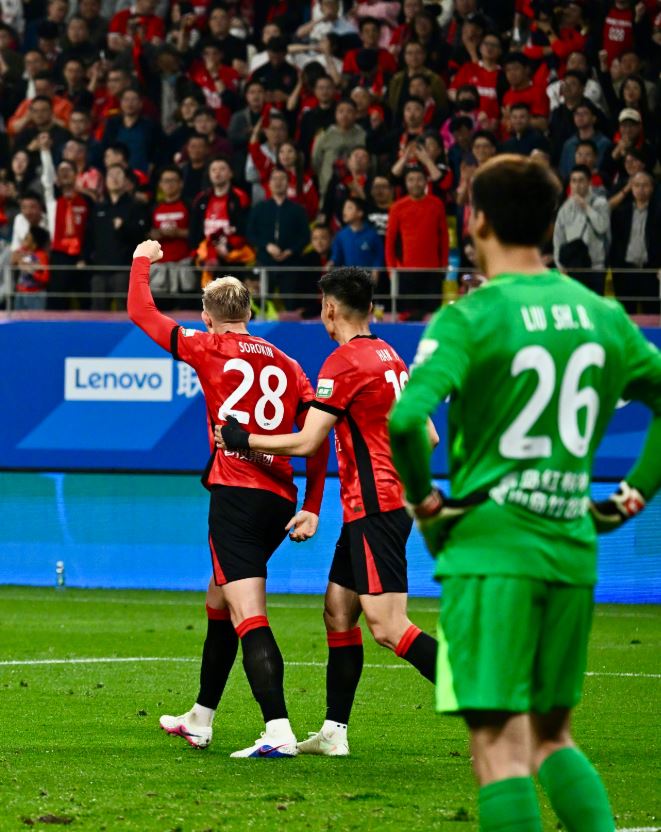 第40分钟,罗慕洛禁区前左脚远射,刘世博扑救脱手,索尔金补射破门,2比0!索罗金打入成都蓉城处子球。