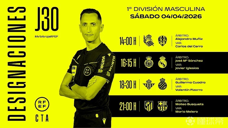 西班牙足协官方公布了周六西甲4场比赛的裁判安排,马特奥-布斯克茨将执法马德里竞技vs巴塞罗那。周六西甲裁判安排:皇家社会vs莱万特主裁:亚历杭德罗-穆尼斯(VAR:卡洛斯-德尔塞罗)马略卡vs皇家马德里主裁:何塞-桑切斯(VAR:哈维尔-伊格莱西亚斯)皇家贝蒂斯vs西班牙人主裁:吉列尔莫-夸德拉(VAR:巴伦廷-皮萨罗)马德里竞技vs巴塞罗那主裁:马特奥-布斯克茨(VAR:马里奥-梅莱罗)