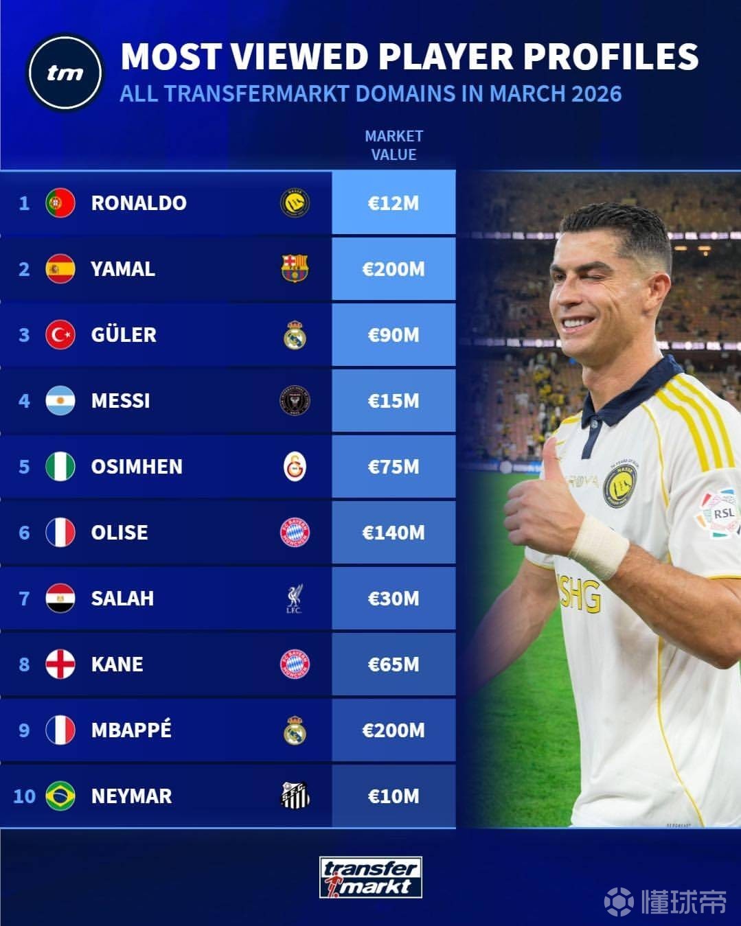 北京时间4月3日,德转发布3月球员页面浏览量排名,C罗位居第一,亚马尔、居莱尔分列二三,梅西第四。德转3月球员页面浏览量排名1.C罗(利雅得胜利)2.亚马尔(巴塞罗那)3.居莱尔(皇家马德里)4.梅西(迈阿密国际)5.奥斯梅恩(加拉塔萨雷)6.奥利塞(拜仁慕尼黑)7.萨拉赫(利物浦)8.凯恩(拜仁慕尼黑)9.姆巴佩(皇家马德里)10.内马尔(桑托斯)