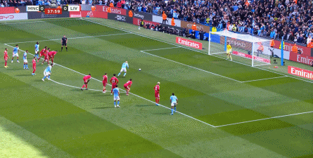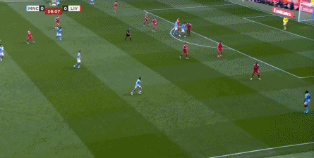 最终在第37分钟,曼城在定位球二次进攻里,不断地用带球和前插来制造利物浦的压力,一点点打到后卫线上,从而制造了范戴克的犯规和点球机会:
