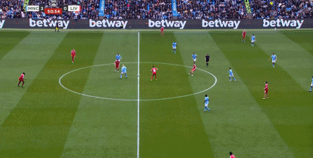 所以在进攻的时候,利物浦的双前锋会拉得非常开,几乎会呈现出各自负责一个半扇的思路,以此来吸引曼城的防守注意力,从而为中路和远端制造空间。
